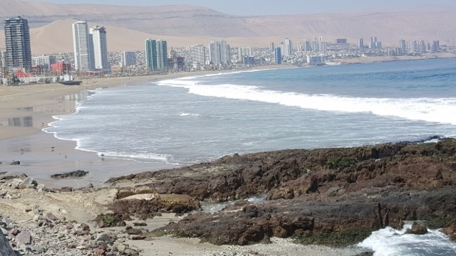 There’s a bunch of high-rise and residential all packed between the water the the giant dunes behind.